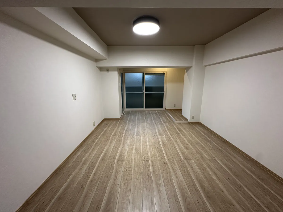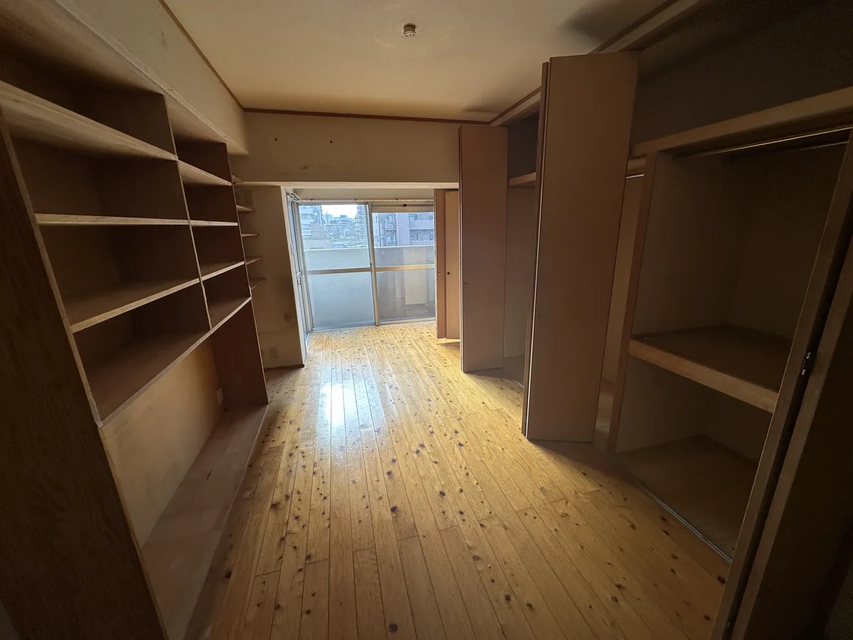 古い収納の撤去によって壁面がすっきりし、新しいフローリングとの組み合わせで空間全体のバランスも大きく向上しています。