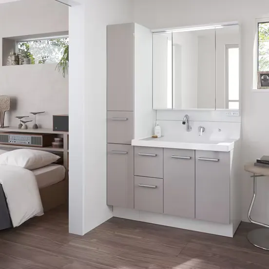 「シーライン」は10〜15万円台で、LED照明付き三面鏡やカウンターの色を選ぶことができます。上位機種「ラシス」は20〜40万円台で、ホテルライクなデザインが特徴です。