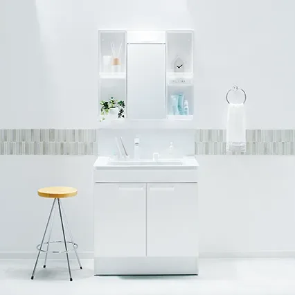 洗面台の本体価格は、グレード等によって大きく変わります。一般的に、収納力やデザイン性、機能(LED照明・三面鏡・タッチレス水栓など)が充実するほど価格が上がります。