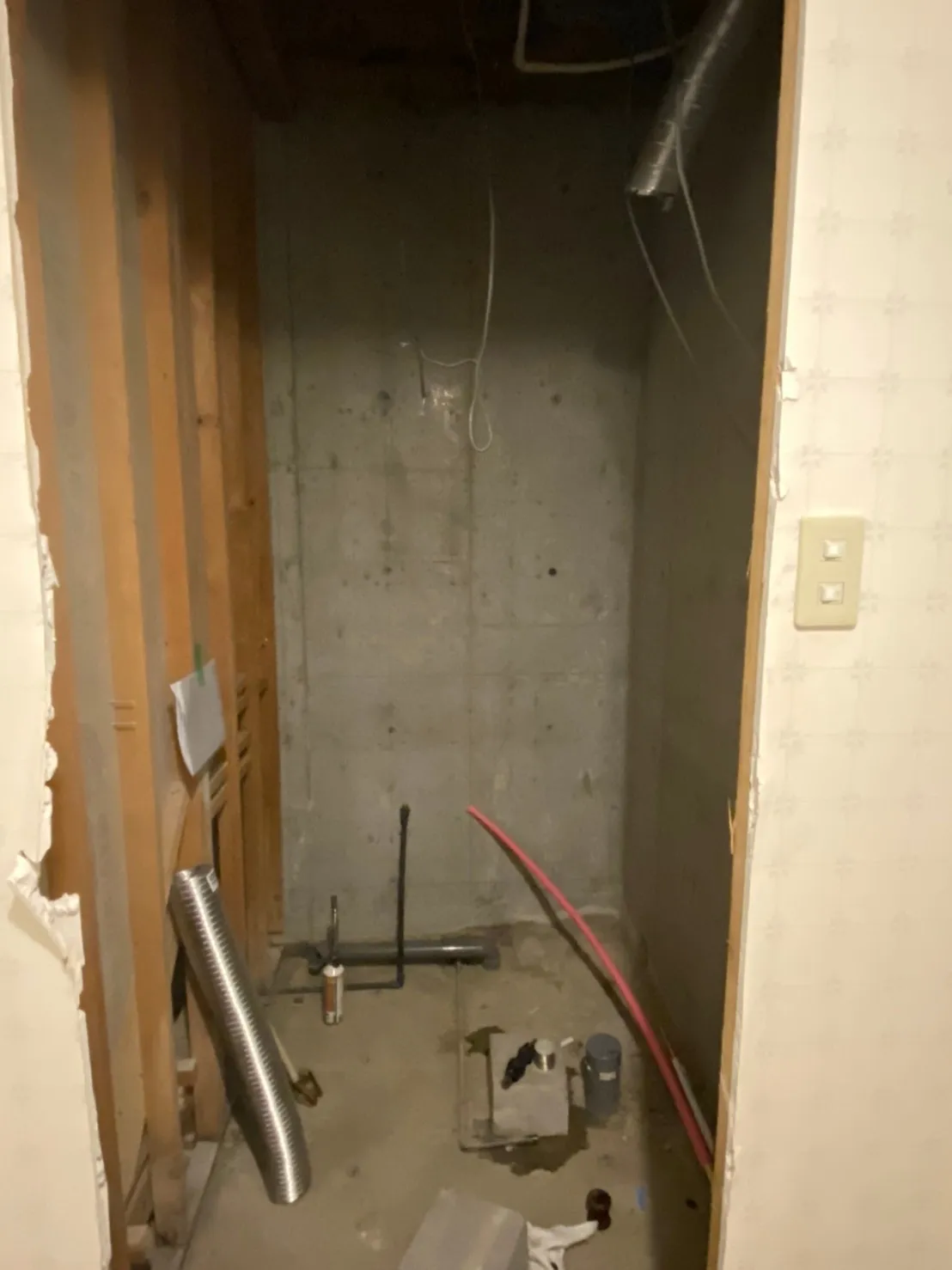 既存浴室の解体と、新しいユニットバスを組み立て中の施工風景です。