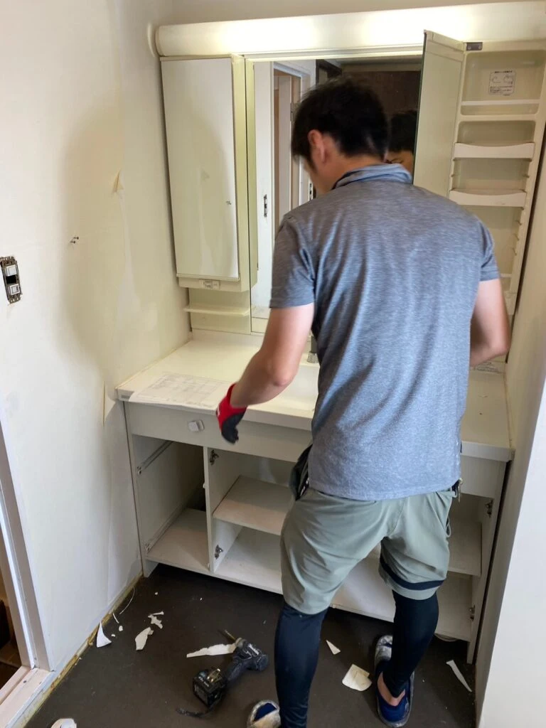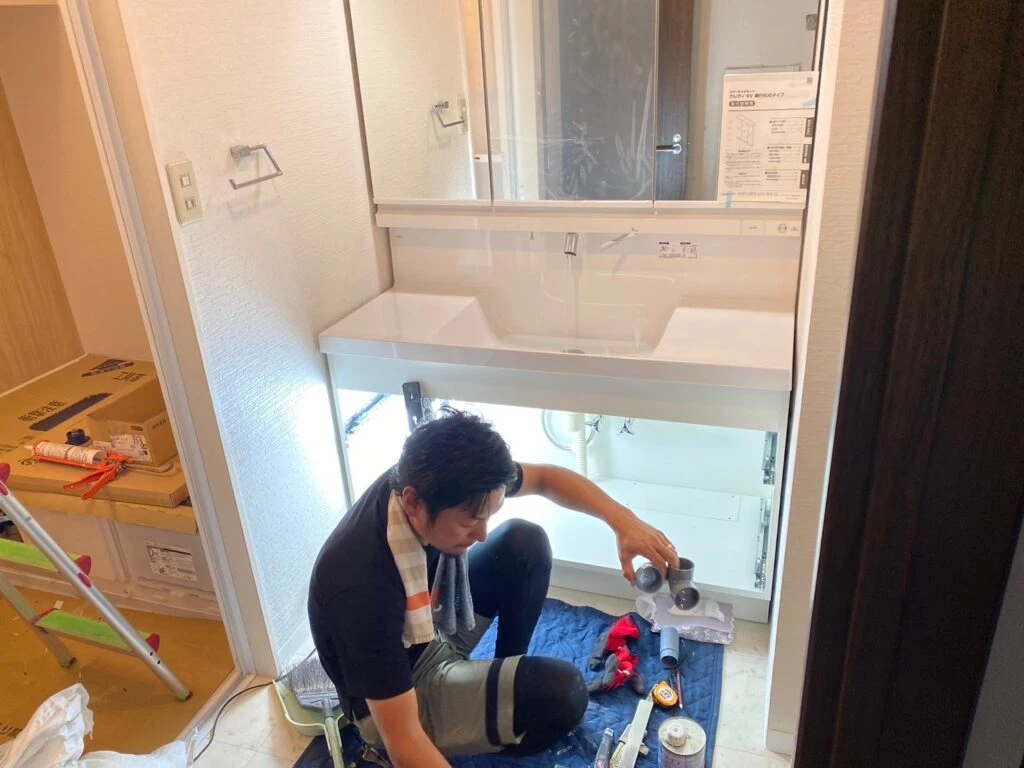 既存の洗面台の一部を取り外す準備を進めているところで、収納部の扉を取り外し、内部の構造や配管の確認を行っています。