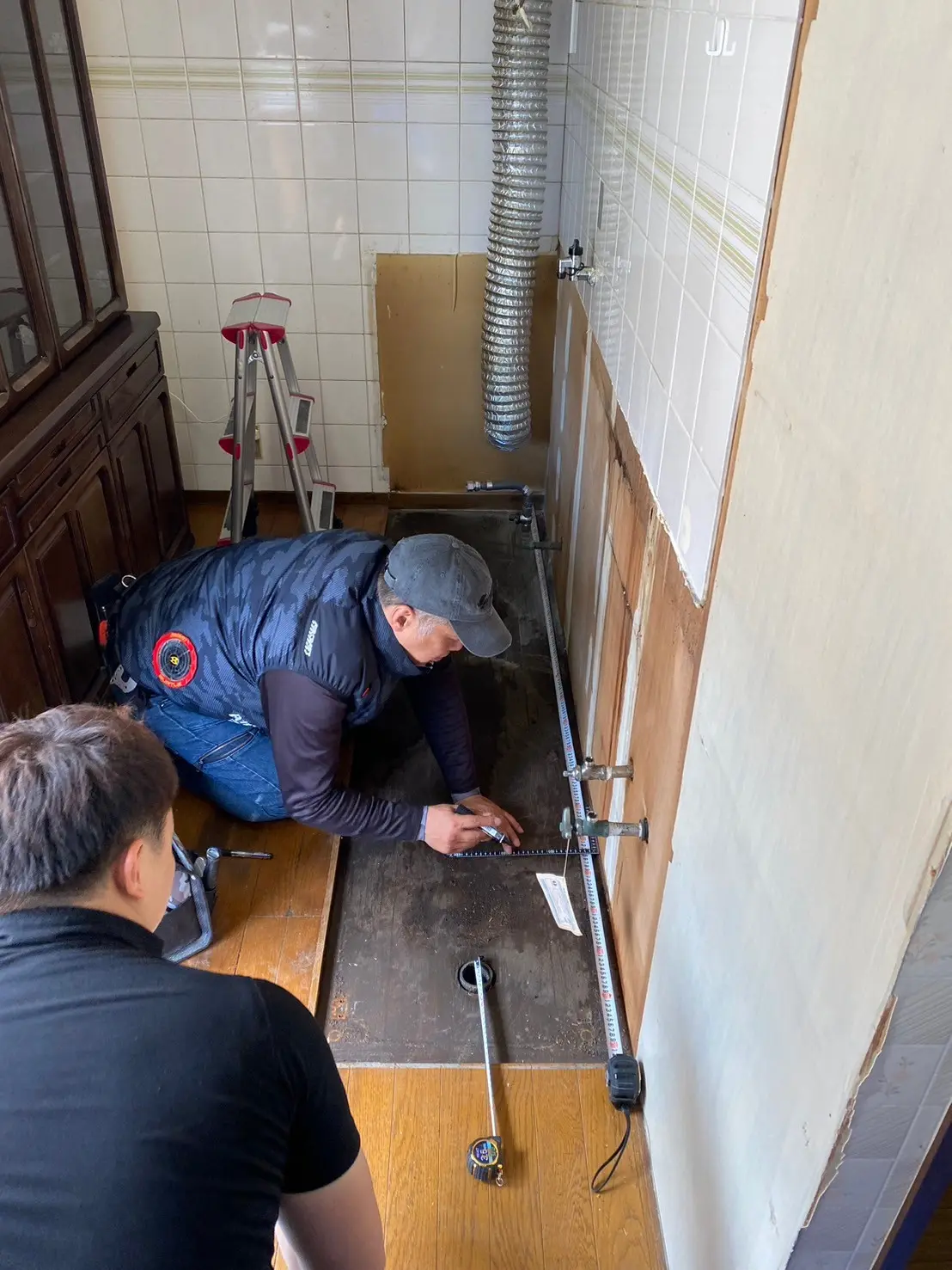 吊戸棚を撤去し、水栓仕様や配管の状態確認、寸法などを綿密に行いました。